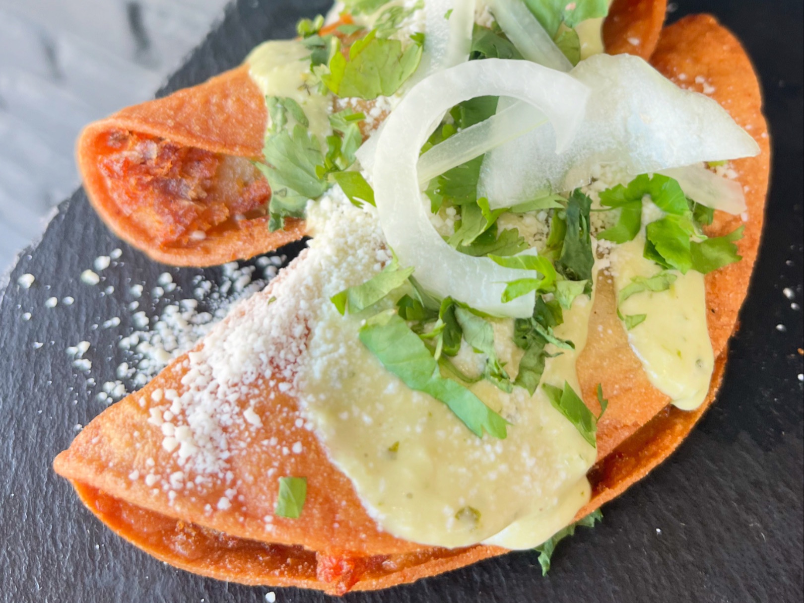 crunchy Potato taco, cilantro aioli, Cotija cheese, onions, cilantro