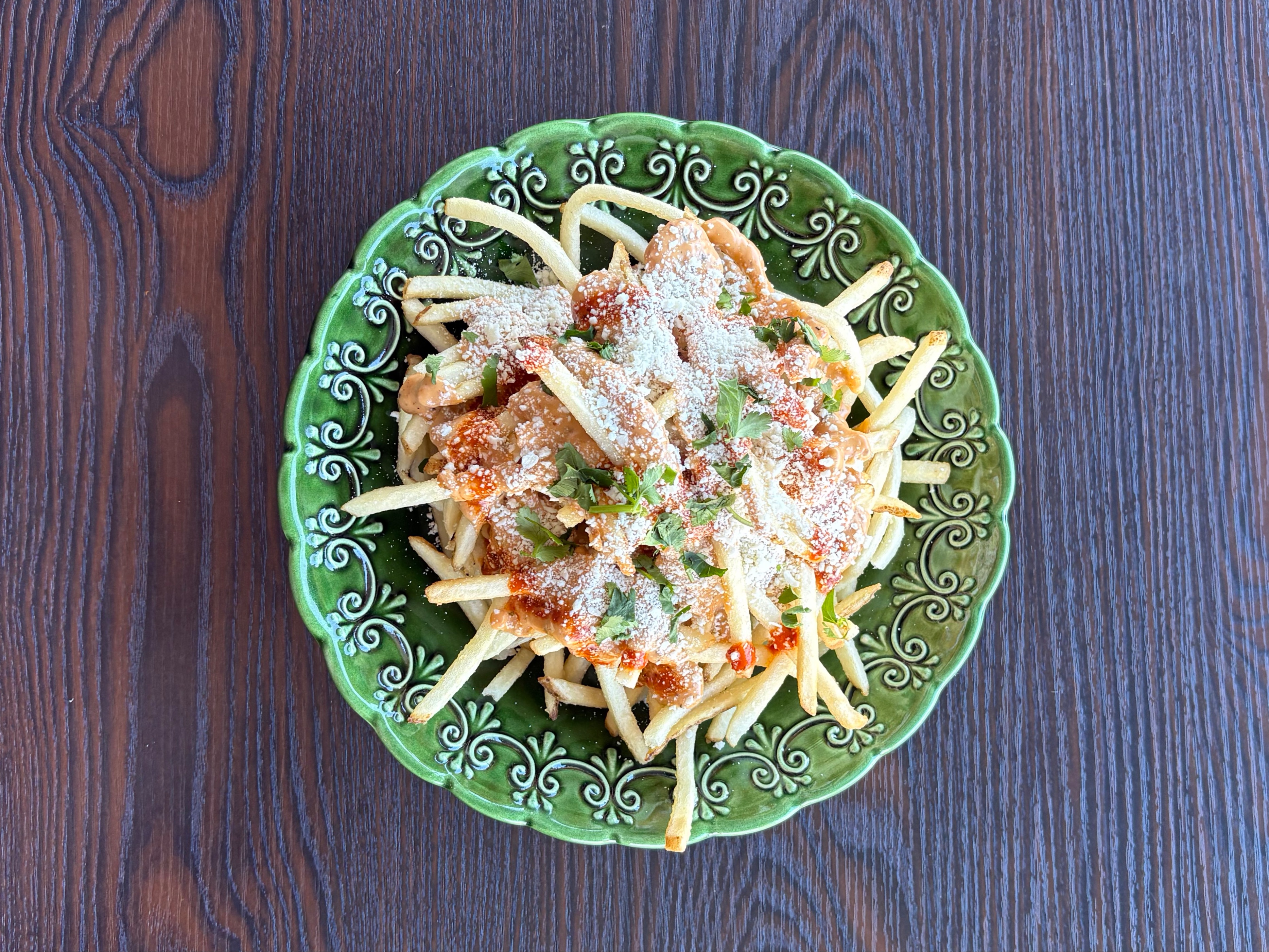 Crispy French fries topped with a smokey Burnt aioli, Spicy red salsa, crumbled cotija cheese, and fresh cilantro.