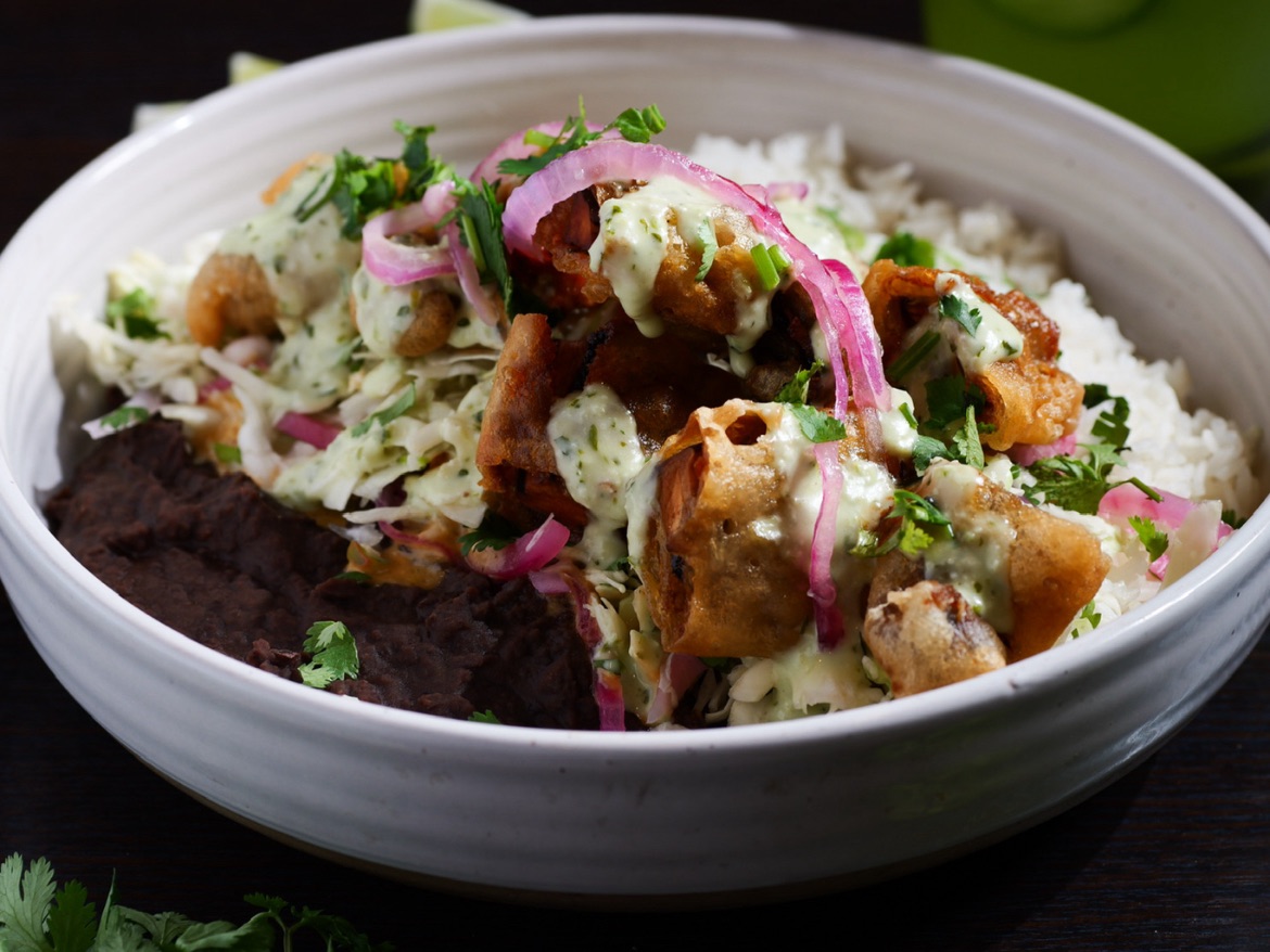 YELLOW CHILI TOSSED IN CORNMEAL AND FRIED TO PERFECTION TOPPED WITH WHOLE BLACK BEANS, ROASTE CORN, TOSSED PEPITA SEEDS, COTIJA CHEESE, CREAMY VEGAN CILANTRO AIOLI, CILANTRO LIME RICE AND HEARTY BEANS WRAPPED IN A FLOUR TORTILLA