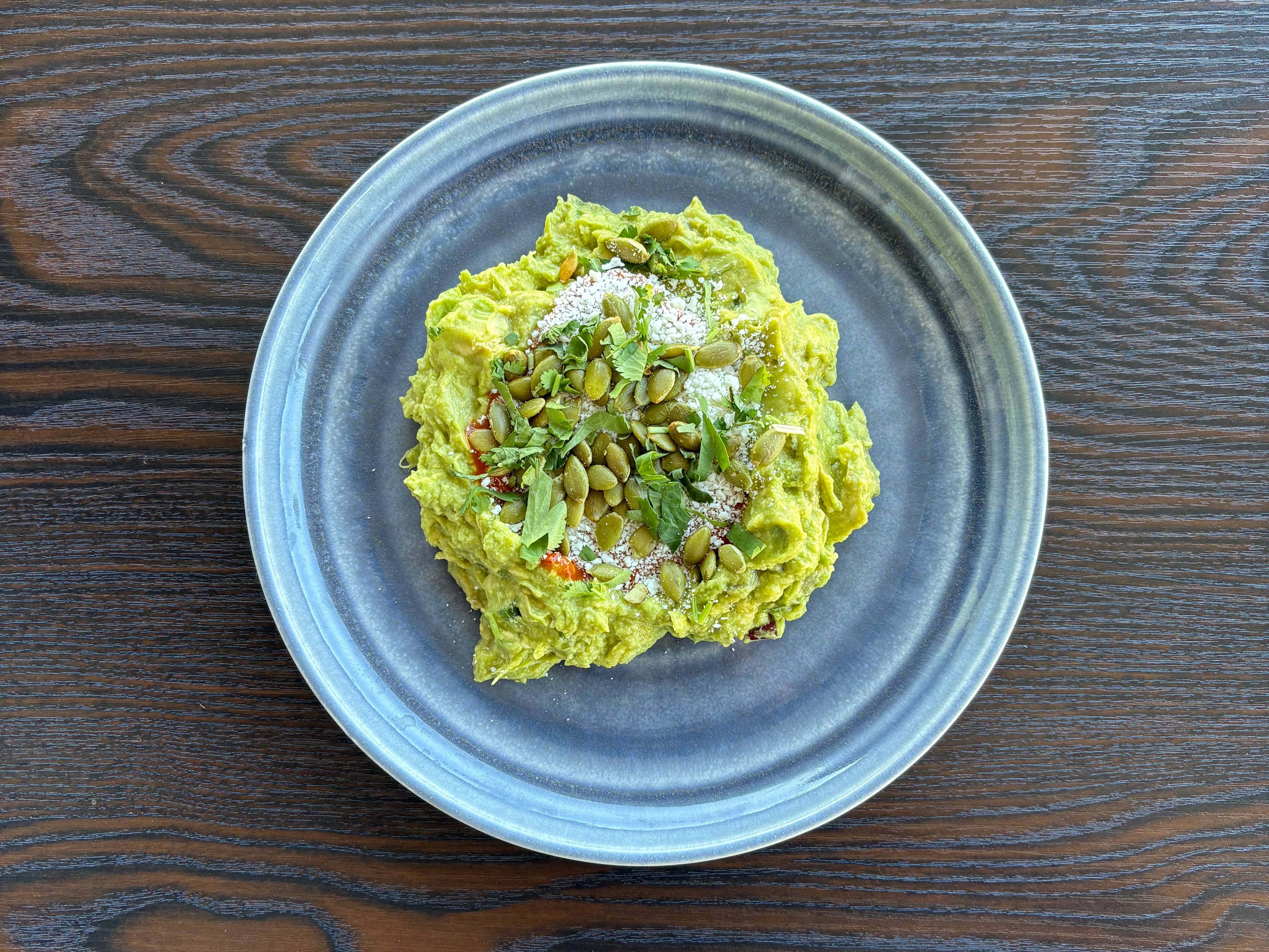 YELLOW CHILI TOSSED IN CORNMEAL AND FRIED TO PERFECTION TOPPED WITH WHOLE BLACK BEANS, ROASTE CORN, TOSSED PEPITA SEEDS, COTIJA CHEESE, CREAMY VEGAN CILANTRO DRESSING.