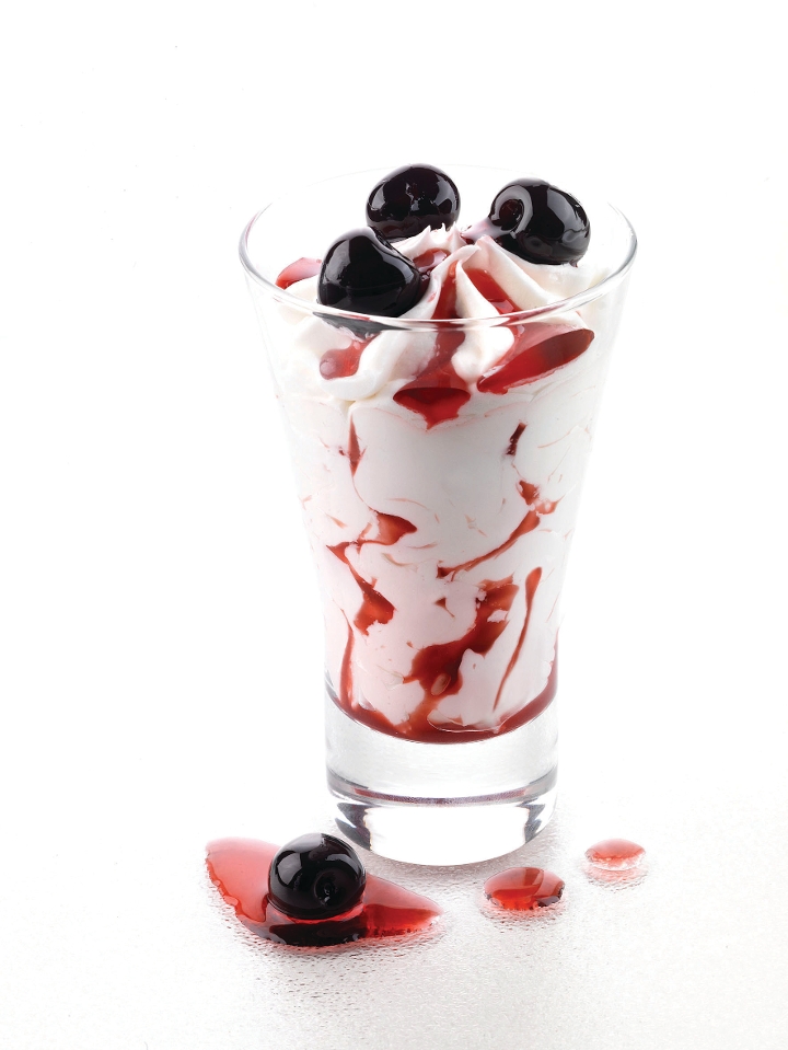 Gelato ice cream with sour cherry sauce topped with Amarena cherries. Served in a glass cup.