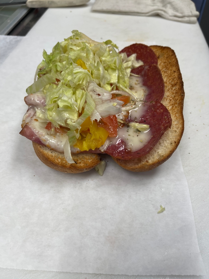 Ham, salami, provolone, onion, lettuce, tomato, pepperonicini, and creamy Italian dressing. Sprinkled with oregano.