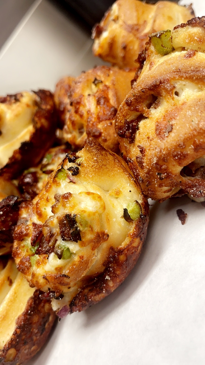 4 fluffy, baked, rolled and stuffed with savory items like Pepperoni, Mozzarella, Pastrami or Meatballs. Finished with Butter, Grated Parmesan, Garlic and Italian Seasonings.