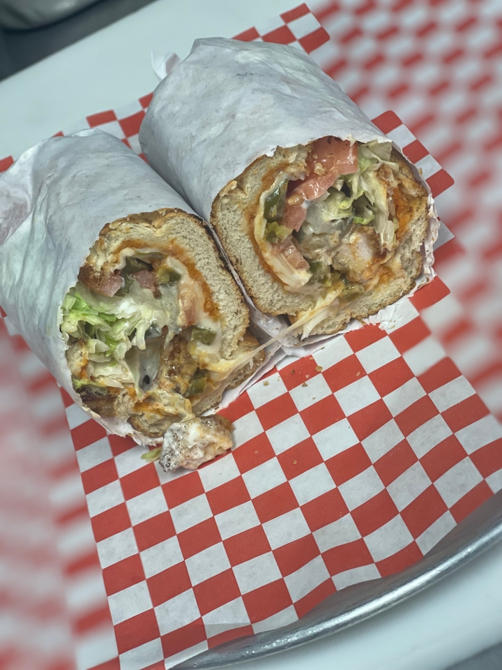 Buffalo sauce, crispy chicken breast, onion, provolone, tomatoes, pickles, lettuce and mayo.