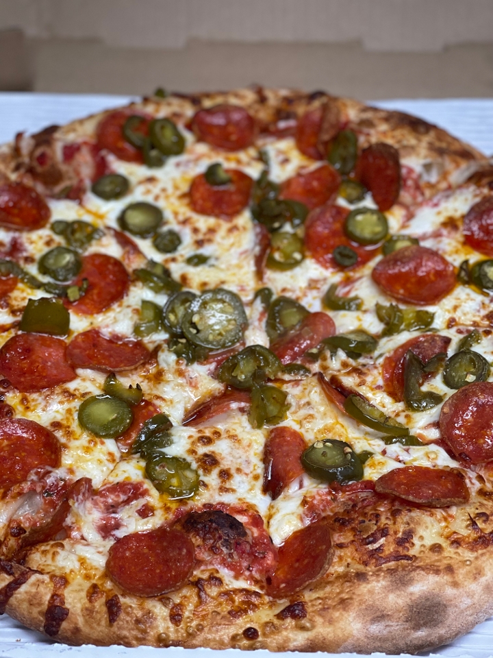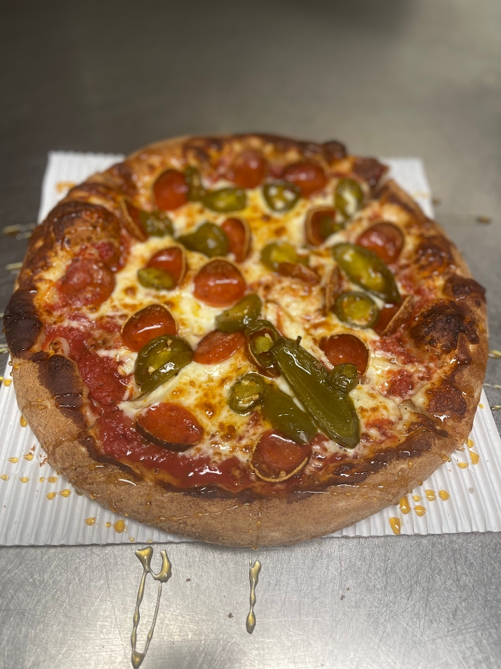 Specialty Cupping Pepperoni, Jalapenos and Mikes Hot Honey Drizzle. Includes a packet of Mikes Hot Honey