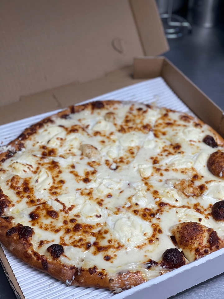 Alfredo sauce base, mozzarella, ricotta and fresh garlic. Finished with a garlic butter crust.