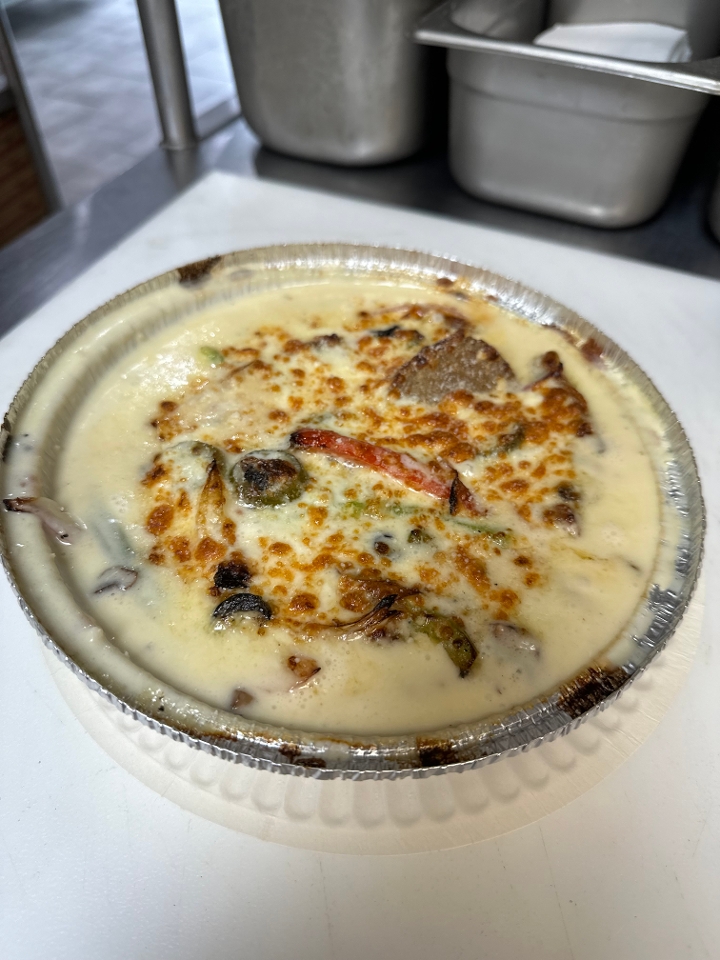 Alfredo sauce, meatballs, onions, bell peppers, olives, mushrooms, jalapenos and mozzarella cheese.