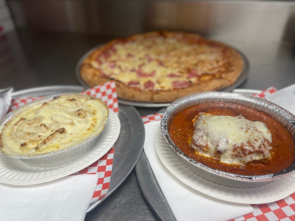 Marinara sauce, mozzarella, provolone, and breaded chicken. Sprinkled with grated parmesan and Italian seasoning.